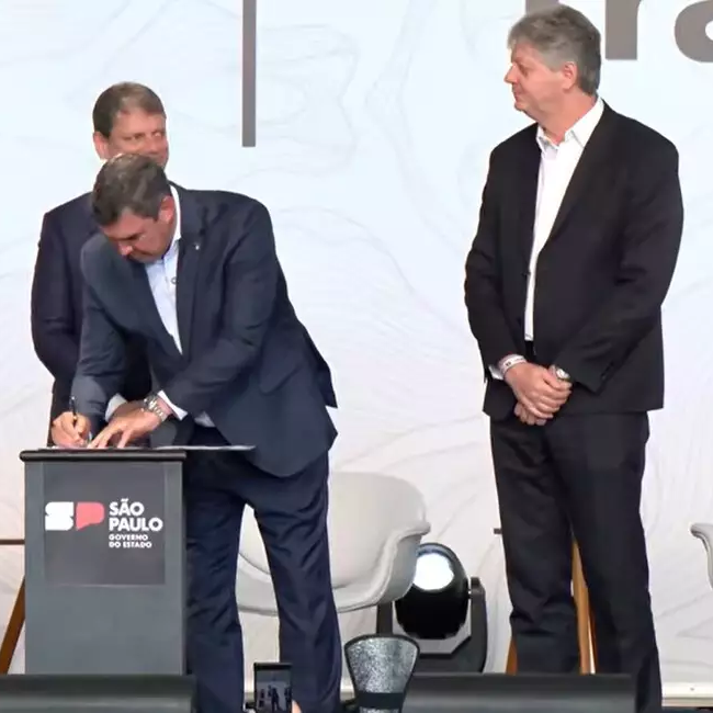 Riedel assina carta de intenções, junto com Tarcísio e Verruck, acompanhados por autoridades de SP (Img: Reprodução)