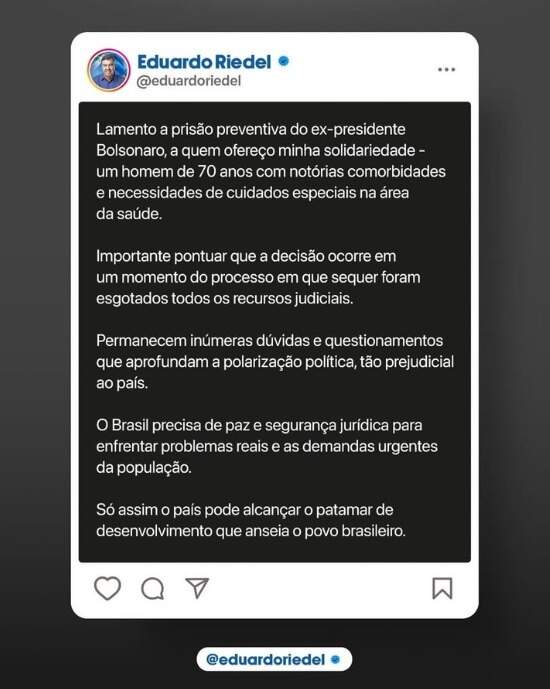 Nas redes sociais, Riedel ainda ressaltou a fragilidade da saúde de Bolsonaro, a quem descreveu como "um homem de 70 anos com notórias comorbidades e necessidades de cuidados especiais na área de saúde".