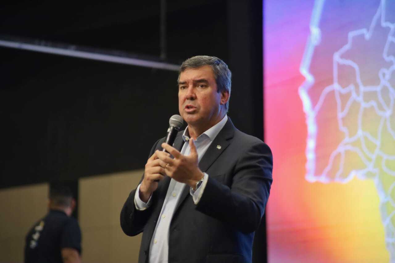 Governador Eduardo Riedel (PP) durante discurso em congresso de prefeitos (Foto: Paulo Francis)