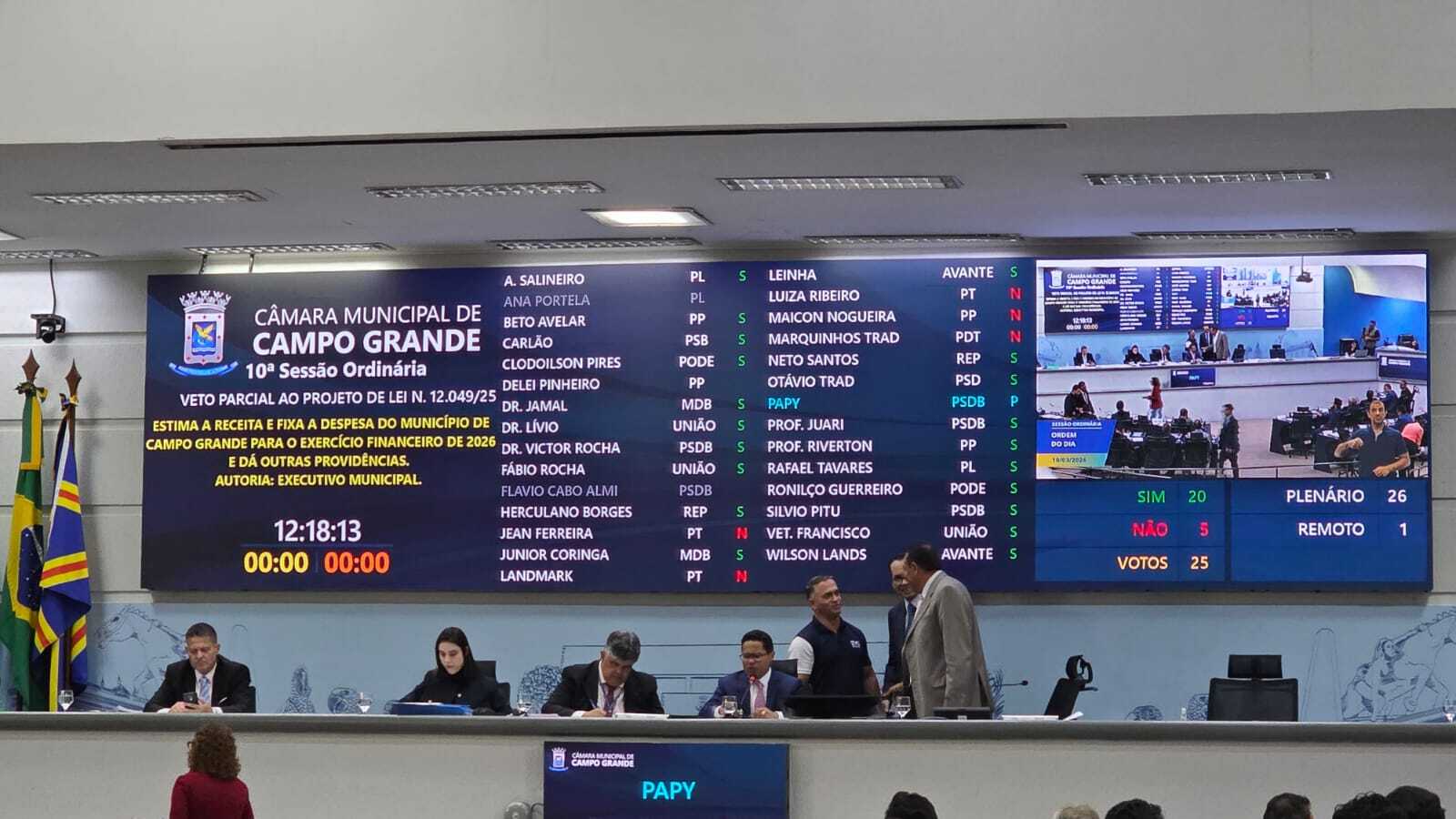 A Câmara Municipal de Campo Grande derrubou vetos do Executivo a 52 emendas no orçamento municipal, sendo 39 da Lei Orçamentária Anual e 13 do Plano Plurianual. As propostas incluem obras de infraestrutura, saúde, programas sociais e causa animal, que haviam sido vetadas pela prefeitura por incompatibilidade orçamentária. Entre os principais investimentos reincluídos estão a construção de um hospital veterinário, drenagem e pavimentação no Parque do Lageado, programa de castração de animais e um Centro de Referência para pessoas com autismo. O presidente da Câmara, Papy, criticou o veto da prefeitura, afirmando que as emendas foram baseadas em demandas da população.