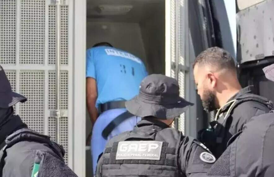 Marcinho VP, líder do CV, entrando em camburão durante transferência para Campo Grande, em janeiro do ano passado (Foto: Senappen/Divulgação)