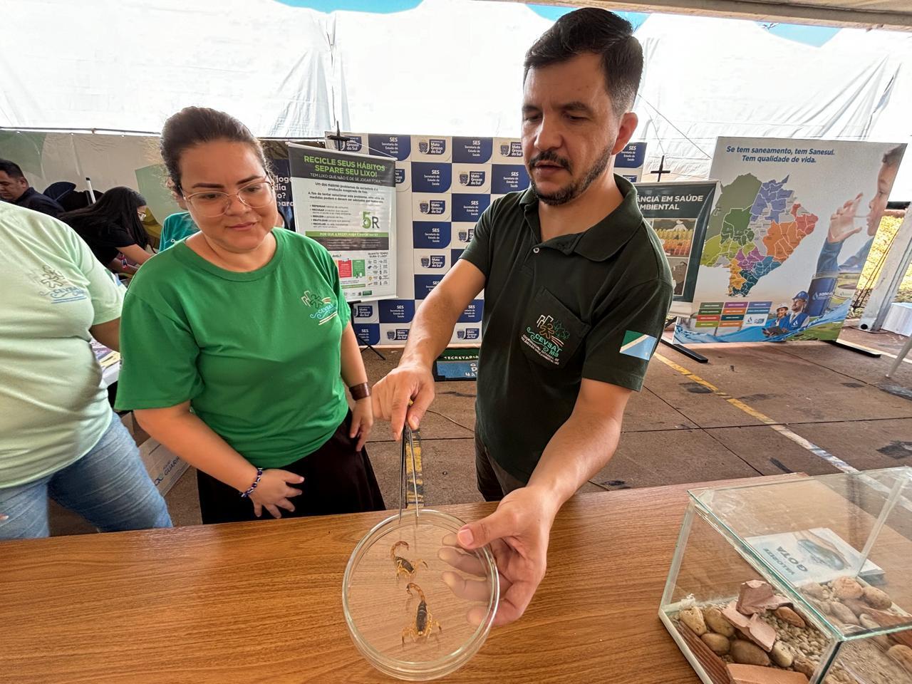 Coordenador da Vigilância Ambiental, Karyston manipula escorpiões mortos durante evento educativo (Foto: Divulgação/SES)